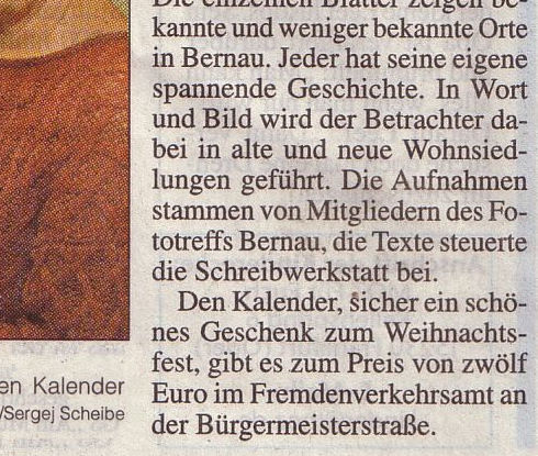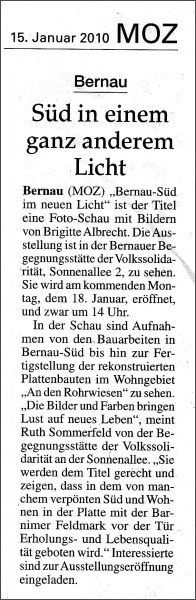 23. Ausstellung "Bernau-Süd im neuen Licht" in der Begegnungsstätte der Volkssolidarität, Sonnenallee 2, Bernau-Süd bis Ostern, 5.4.2010 ( Ausstellungseröffnung am 18.01.2010 ) |