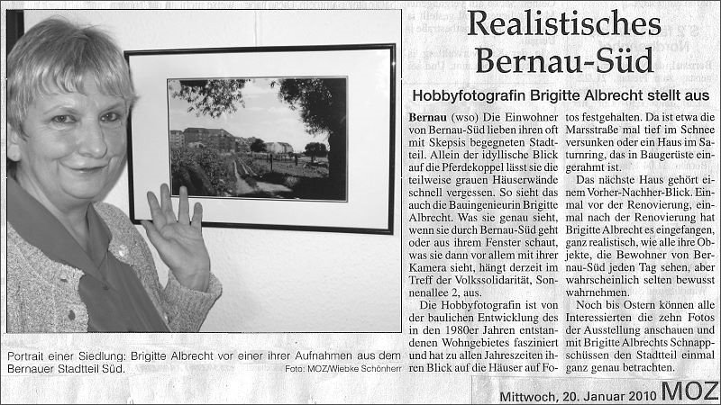 23. Ausstellung "Bernau-Süd im neuen Licht" in der Begegnungsstätte der Volkssolidarität, Sonnenallee 2, Bernau-Süd bis Ostern, 5.4.2010 ( Ausstellungseröffnung am 18.01.2010 ) |